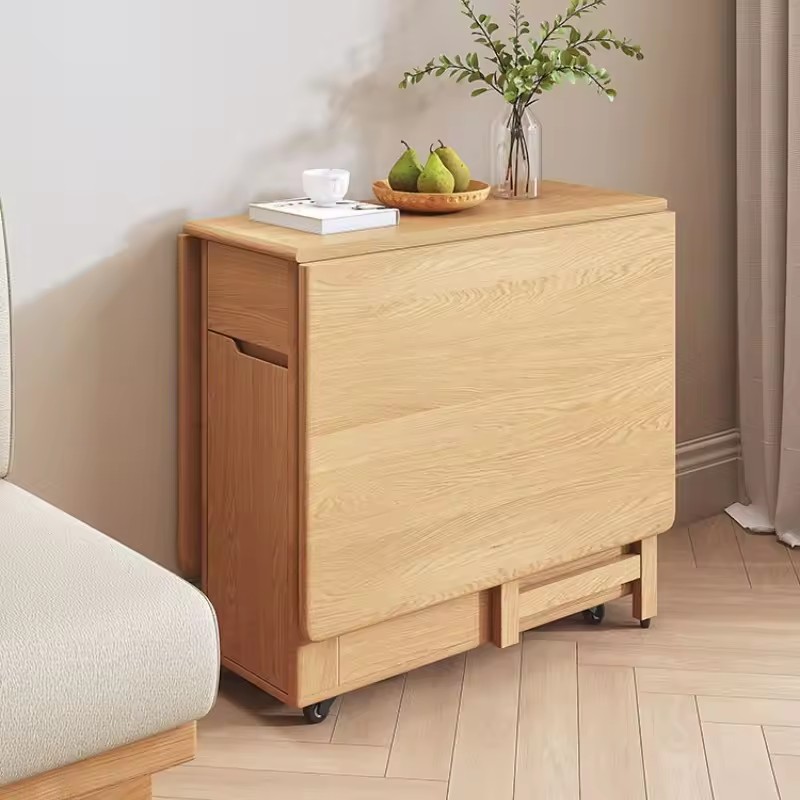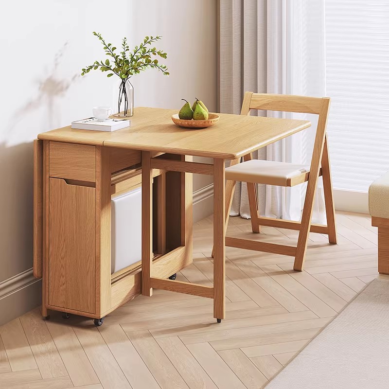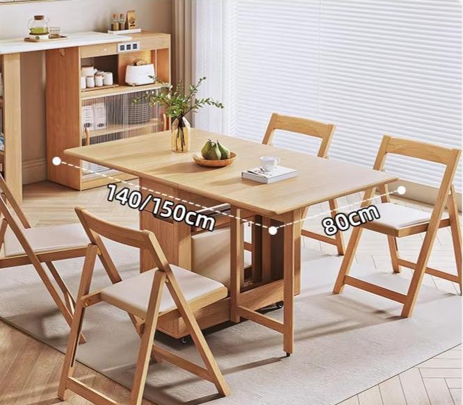 Our Solid Wood Foldable Dining Table redefines small-space living with its innovative design that combines functionality, style, and convenience. This multi-purpose table seamlessly transforms from a compact side cabinet to a spacious dining table, complete with integrated storage for up to four matching chairs—perfect for modern apartments, small homes, and anyone seeking versatile furniture solutions.