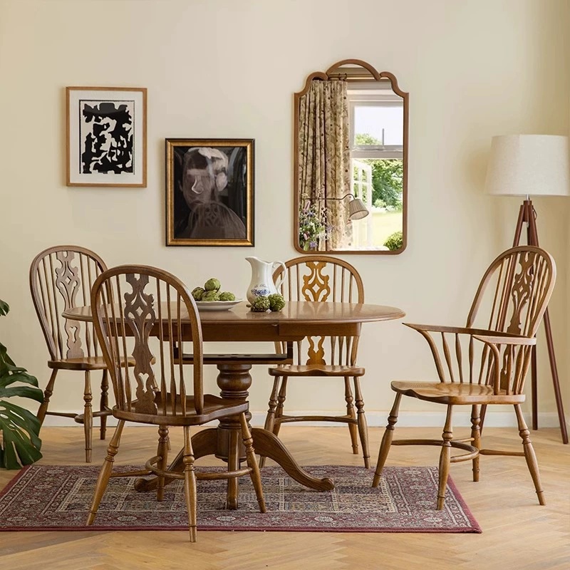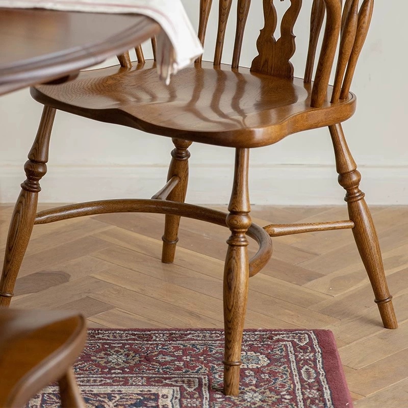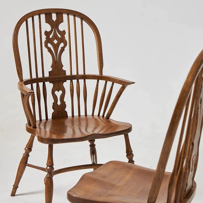 Our solid wood Windsor armchair is a masterpiece of traditional woodworking, combining robust construction with refined details. Crafted from 100% solid wood, it boasts a distinctive Windsor-style spindle back adorned with intricate openwork carvings, creating a striking visual focal point. The 2mm thin handrail is meticulously finished to be smooth and safe, while the 4cm thick saddle-shaped seat offers exceptional comfort for extended sitting. With a choice between saddle-shaped and regular flat seats, this chair adapts to diverse needs and decor styles. Whether used as a dining chair, study chair, or accent piece, it delivers lasting durability and timeless charm to elevate any living space.