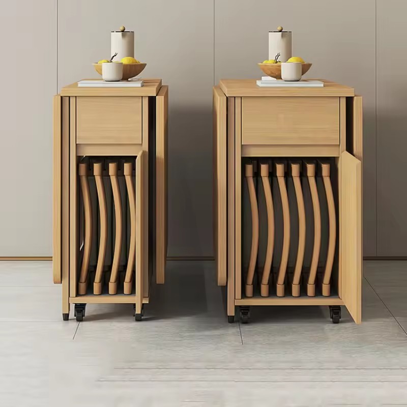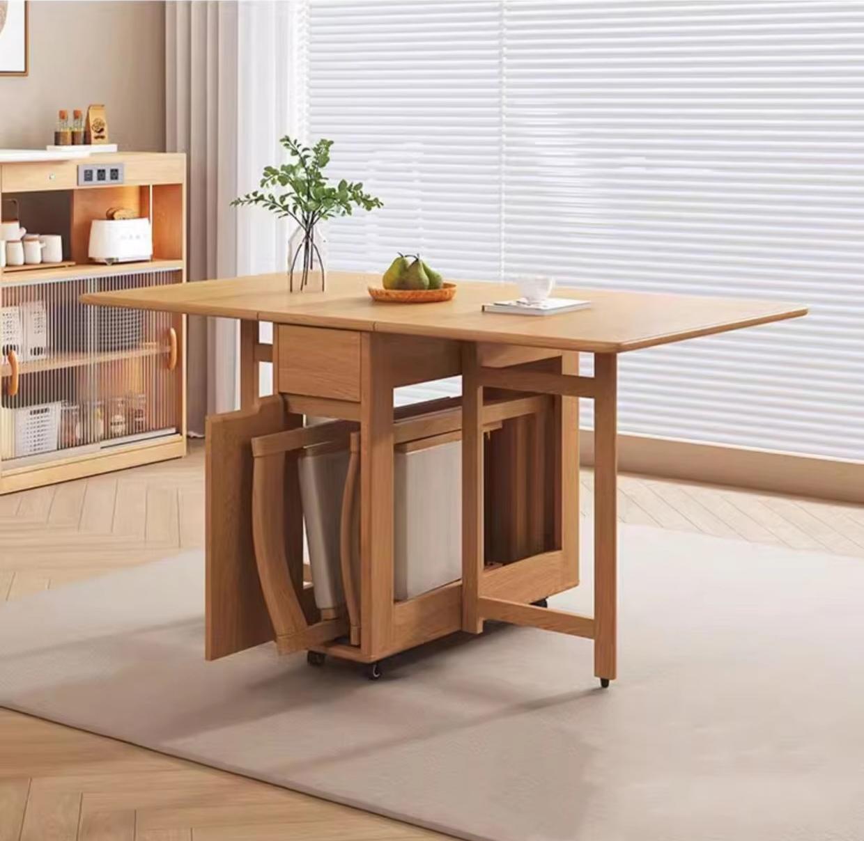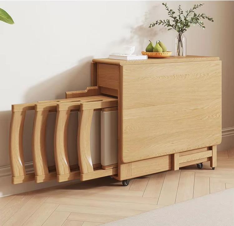 Our Solid Wood Foldable Dining Table redefines small-space living with its innovative design that combines functionality, style, and convenience. This multi-purpose table seamlessly transforms from a compact side cabinet to a spacious dining table, complete with integrated storage for up to four matching chairs—perfect for modern apartments, small homes, and anyone seeking versatile furniture solutions.